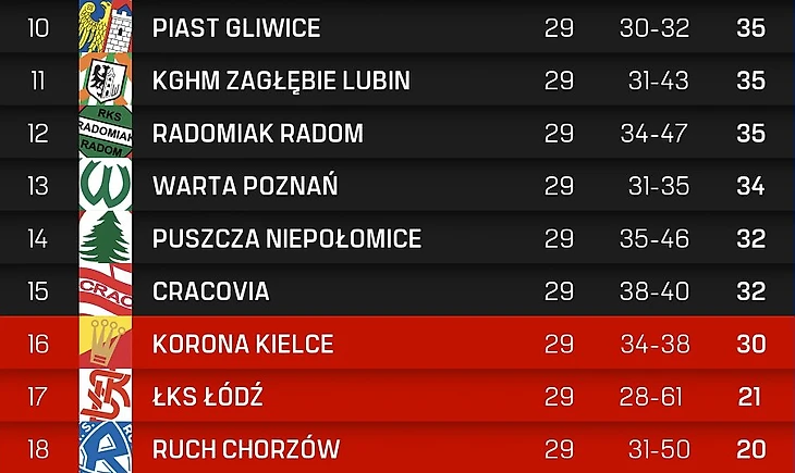 Неделю назад мы разбирали расклады в борьбе за чемпионство Польши, в которой участвуют сразу семь команд, но на противоположном полюсе турнирной таблицы борьба такая же жаркая. Если «Рух» и «ЛКС» спасет уже лишь чудо, то еще семь команд поведут борьбу в оставшихся пяти турах за шесть спасительных мест.