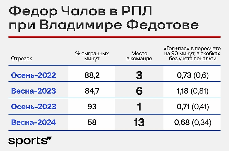 Но в 2024-м влияние Чалова снизилось: меньше него сыграли только Илья Агапов (260 минут), Антон Заболотный (168), Владислав Тороп (90) и Кирилл Глебов (1).
