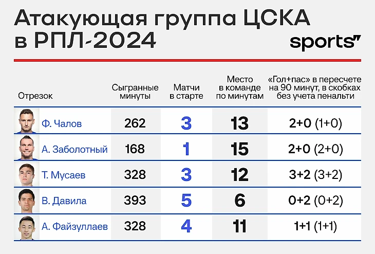 Как итог: среди нападающих ЦСКА в топ-6 по сыгранным минутам только Виктор Давила. Он стартовал в пяти играх из шести и выходил на удобном левом полуфланге (позиции Мусаева, Файзуллаева и Чалова были плавающими).