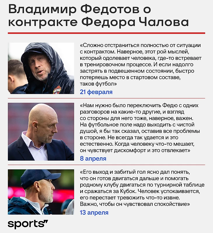 2. Длительные и тяжелые переговоры о новом контракте с ЦСКА. Чалов продавливал более выгодные условия для упрощенного отъезда в Европу: скорее всего, речь о компромиссных отступных. ЦСКА же хотел обновить контракт, чтобы Федор не уехал бесплатно (мог вести переговоры уже летом). Диалог затянулся: стороны объявили о продлении сотрудничества только 9 апреля (прошлый договор действовал до конца 2024-го, новый – до лета 2025-го).
