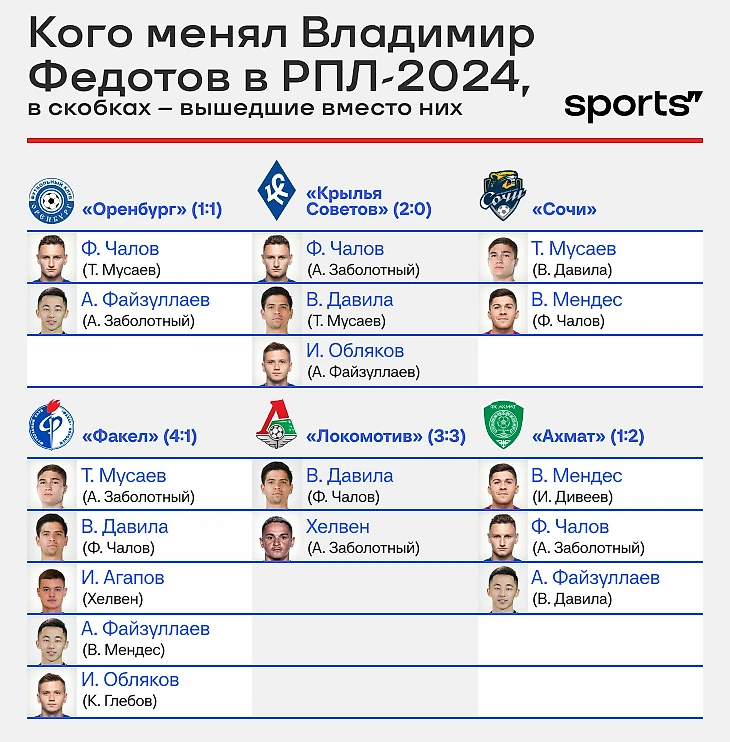 Раньше Федотов минимально ротировал состав, но весной попробовал пять вариантов атакующей тройки за шесть туров, почти все перестановки по ходу матчей связаны с нападающими.