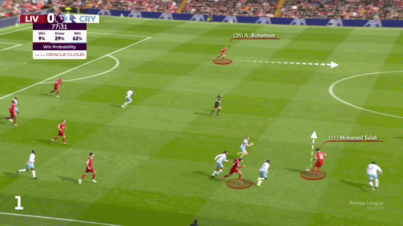 Здесь, в заключительные 15 минут, «Ливерпуль» возвращает себе владение мячом после атаки «Пэлас» и устремляется вперед, чтобы наказать в переходный момент. Когда Салах получает мяч и разворачивается в центре поля (слайд 1), у него есть два партнера по команде — Энди Робертсон или более агрессивный пас на ход Коди Гакпо (черные стрелки, слайд 2).