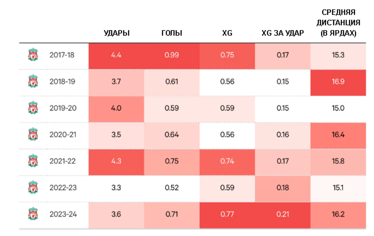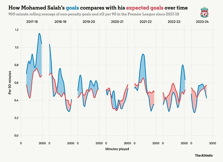В прошлом сезоне это произошло поздно. В 2018/19 и 2021/22 гг. это произойдет скорее в середине сезона. В 2017/18 годах голевая отдача Салаха стабильно превышала ожидания на протяжении всего сезона.