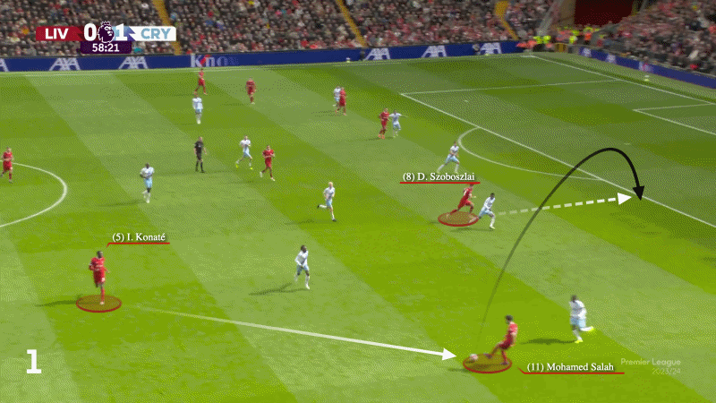 Когда Ибраима Конате разыгрывает мяч, Доминик Собослаи проникает за защитную линию «Пэлас». Когда Салах получает мяч, мы уже привыкли к тому, что он играет в касание на пространство (черная линия). Однако, когда он смотрит на мяч, единственным вариантом для него остается ответный пас Конате, когда игроки «Пэлас» выходят вперед.