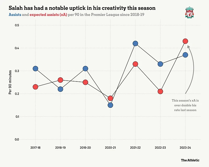 С учетом отсутствия Александер-Арнолда, ни один игрок «Ливерпуля» в этом сезоне не создал больше моментов, чем Салах, в четырех соревнованиях, в которых они принимали участие. Его показатель 0,4 ожидаемых передач в лиге (xA), который измеряет xG-ценность созданного удара, за 90 минут является лучшим в составе «Ливерпуля».