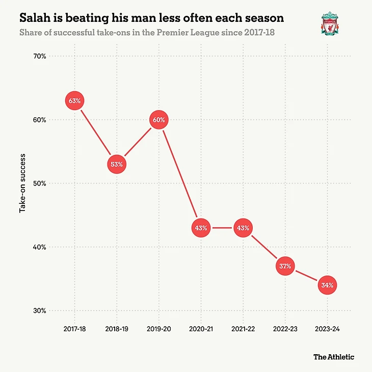 Салах обыгрывает соперника менее часто с каждым сезоном