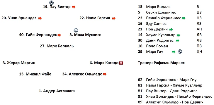 Во втором тайме на поле появился Марк Гиу и ответил на все вопросы, чем он занимался в последнее время и как у него дела в целом. Первый гол центральный нападающий создал после заброса Марка Касадо. Марк Гиу был настойчив и хладнокровен - первоклассный рабочий гол.