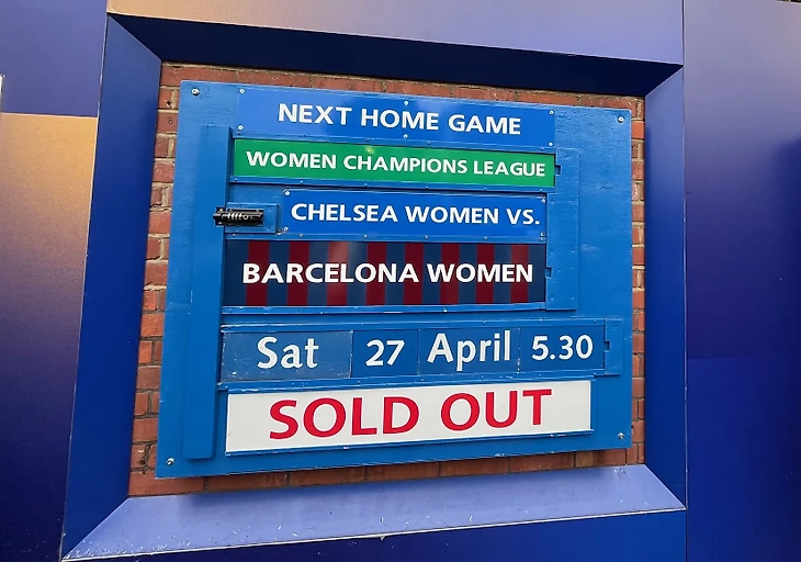 Милое и немного старомодное табло сообщает, что все билеты проданы. С посещаемостью у английского женского футбола все очень неплохо – я писал здесь об осенней встрече «Арсенала» и «Челси», за которой на «Эмирейтс» наблюдали 59 тыс. зрителей.