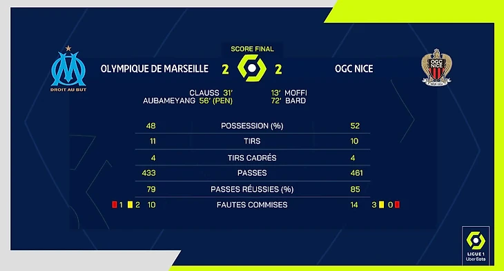 Раздосадованные болельщики «Марселя» постепенно свыкались с мыслями об очередном возможном поражении своей команды, когда вдруг на 54-й минуте матча, самый стабильный игрок сезона Леонардо Балерди заработал пенальти после подачи углового, а лидер «провансальцев» Пьер-Эмерик Обамеянг реализовал свою попытку и забил свой 12-гол в текущем чемпионате Франции — 2:1. «Олимпик» попытался припарковать автобус у своих ворот, но все надежды «Марселя» на победу разбил молодой защитник «Ниццы» Мелвин Бар. На 72-й минуте, Бар дальним ударом из-за штрафной пробил в дальний угол ворот Пау Лопеса и сравнял счёт в матче — 2:2. В самой концовке «Марсель» имел два шанса для того чтобы вырвать победу, но сначала вышедший на замену Илиман Ндиайе не воспользовался прекрасным моментом и пробил во вратаря, а затем Обамеянг не реализовал выход один на один и пустил мяч в перекладину. Матч окончен — 2:2.