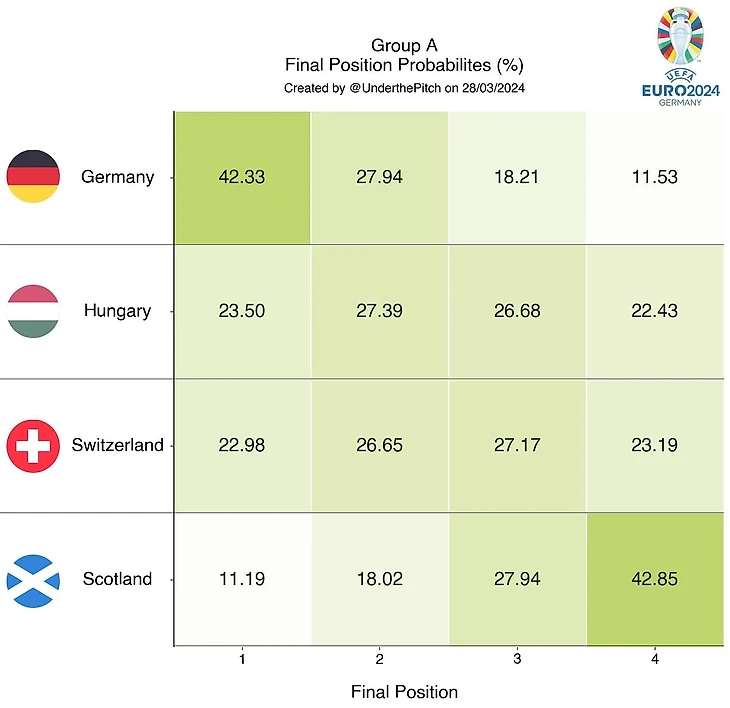 Ютубер Джеймс Элкотт с помощью модели машинного обучения 10 тысяч раз просимулировал весь турнир Евро-2024. Он стартует 14 июня матчем сборных Германии и Шотландии.