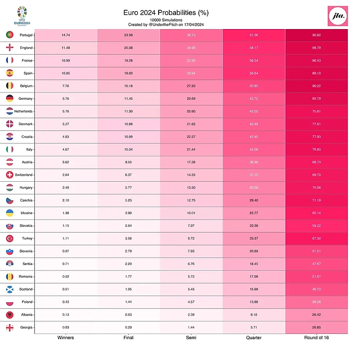 Наиболее вероятным чемпионом, по версии проведенной симуляции, внезапно стала сборная Португалии. Причем ее преимущество над вторым вероятным победителем − сборной Англии − довольно существенный. На «третьем» и «четвертом» местах оказались сборные Франции и Испании, а вот в Бельгию, Германию и Нидерланды симуляция поверила меньше.