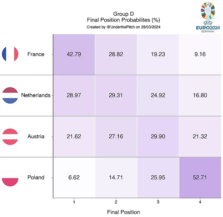 Система не сомневается, что французы пройдут из группы D дальше, как и то, что Нидерланды будут выше Австрии. Однако варианты есть.