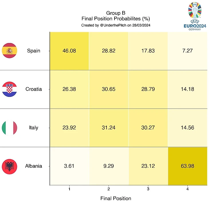 Компьютер предсказывает, что Испания не испытает проблем в группе B, а вот Хорватия с Италией пободаются.
