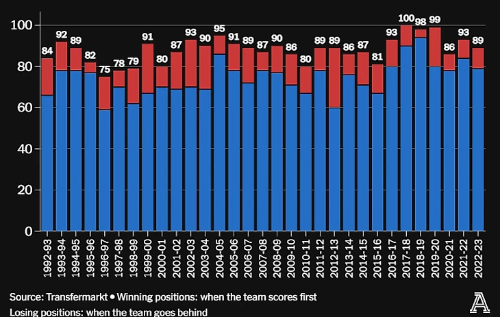 До этого сезона 2020/21 был единственной успешной кампанией, в которой «Сити» достигал двузначного показателя по количеству отставаний в матчах (10). В пяти победных сезонах с 2017/18 по 2022/23 гг. они ни разу не завоевывали более 10 очков с проигрышных позиций. И это несмотря на то, что в худшем случае они набирали 86 очков (2020/21), а в лучшем — 100 (2017/18).