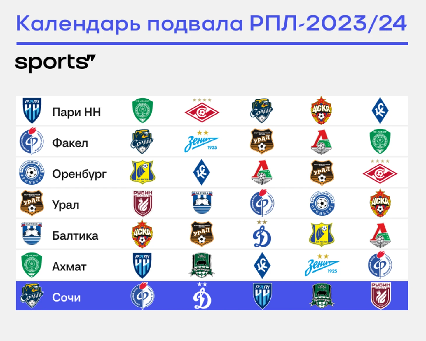 «Сочи» – на грани вылета из РПЛ: после классного рестарта сезона с трудом вырвали ничью с «Уралом» (2:2) и на фоне массового отравления проиграли «Ахмату» (0:1). После 25 туров «Сочи» отстает «Балтики», идущей пятнадцатой, на четыре очка, а от зоны стыков – на пять.