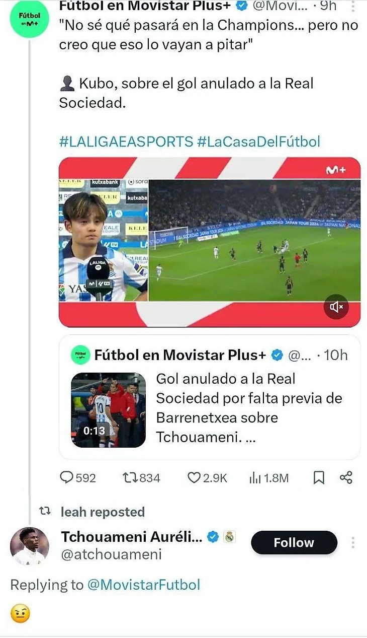 Кубо заявил, что арбитр ошибочно отменил его гол в ворота «Мадрида». Тчуамени ответил на слова японца одним эмодзи