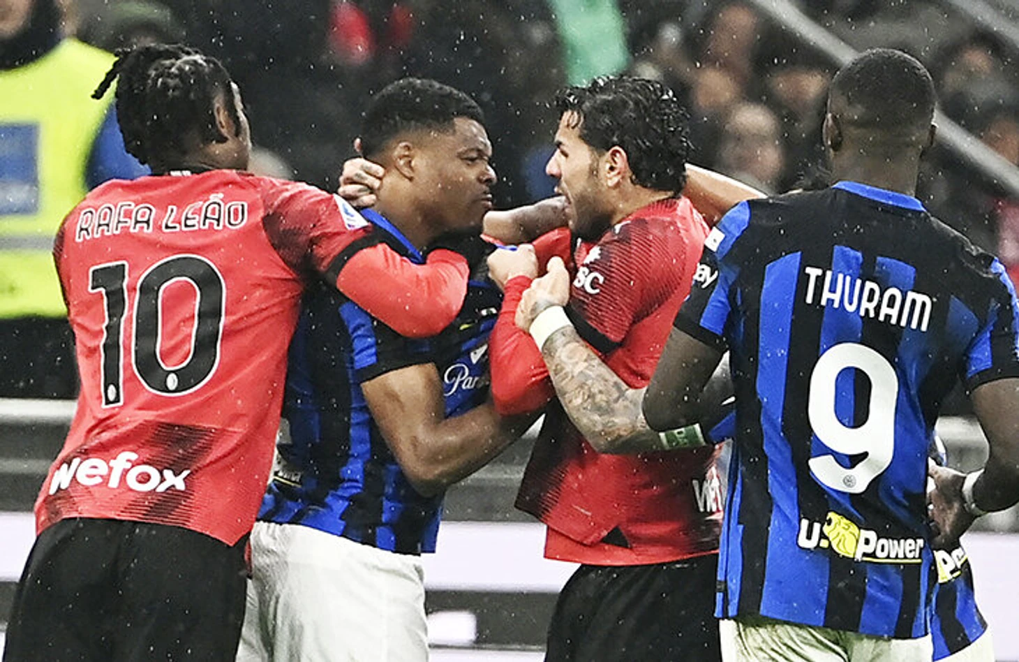 «Интер» стал чемпионом в миланском дерби. Под конец игры Тео сорвался и грубо толкнул в спину Давиде Фраттези. Заступаться за товарища полез Думфрис.