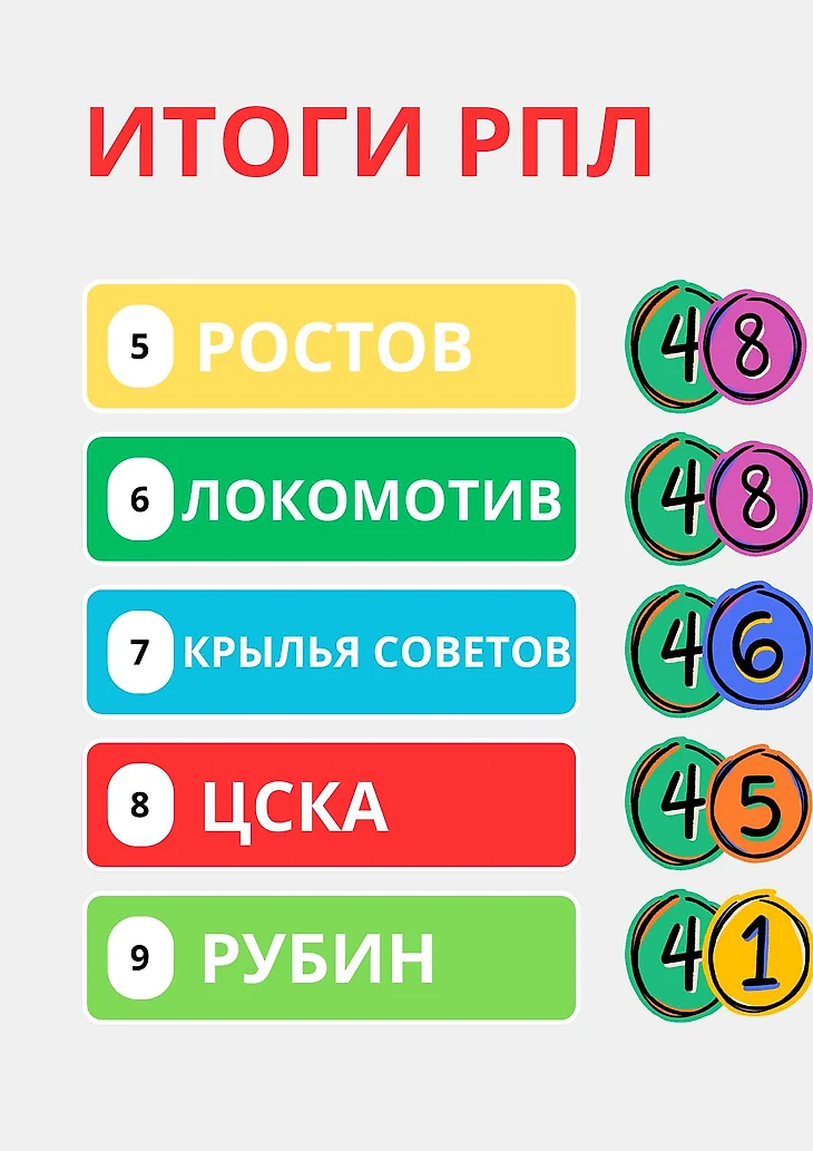 4. Рубин - средние очки набранные за чемпионат 1,42. При этом снова видится спад во второй части сезона. Так как в первой половине средние очки за матч составляли 1,55, а вот во второй показатель сильно просел и составил 1,12. Итого имеем 1,36 за матч или + 5 очков к концу сезона. При этом с учетом календаря (ЦСКА, Ростов, Спартак, Сочи) видится, что 5 очков набрать будет сложно, поэтому скорее верим в итоговые + 4 очка к концу сезона.
