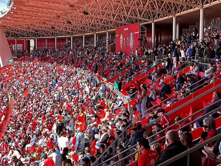 При замечательной организации работы с болельщиками вокруг стадиона и отличном состоянии стадиона в целом, вместимость всего в 15.000 и беговые дорожки – это все-таки не то, чего ждешь от атмосферы игры в Примере.