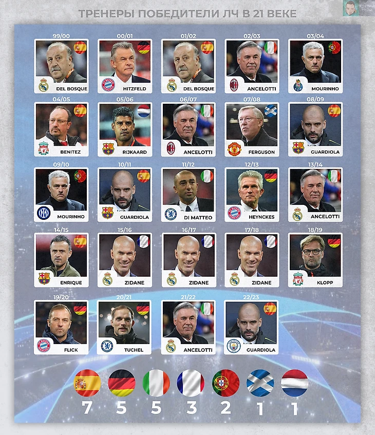 С 2000 по 2023 год в Лиги Чемпионов побеждали тренеры из 7 стран. Лидеры здесь – испанцы. 7 раз менеджеры из Испании брали «ушастого» в свои руки. Лидером по победам является Пеп Гвардиола с тремя кубками («Барселона» – 2 раза, «Манчестер Сити» – 1 раз), дважды ЛЧ выигрывал Висенте Дель Боске с «Реалом», еще по одному разу выигрывали Рафа Бенитез с «Ливерпулем» и Луис Энрике с «Барселоной».
