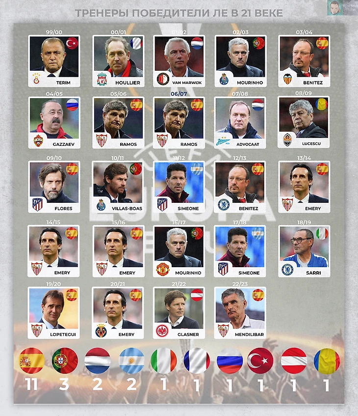 11 испанских побед! Дважды Рамос («Севилья), дважды Бенитез («Валенсия», Челси»), четыре раза Эмери («Севилья» - 3 раза, «Вильярреал» - 1 раз), и по одному разу Флорес («Ателтико»), Лопетегги (Севилья») и Мендилибар (Севилья). Испанцы абсолютные «доминаторы» во втором европейском турнире, как среди клубов, так и среди тренеров. Испанские тренеры за 24 года выиграли турнир 11 раз! Поразительно.