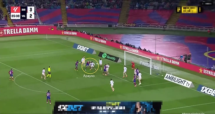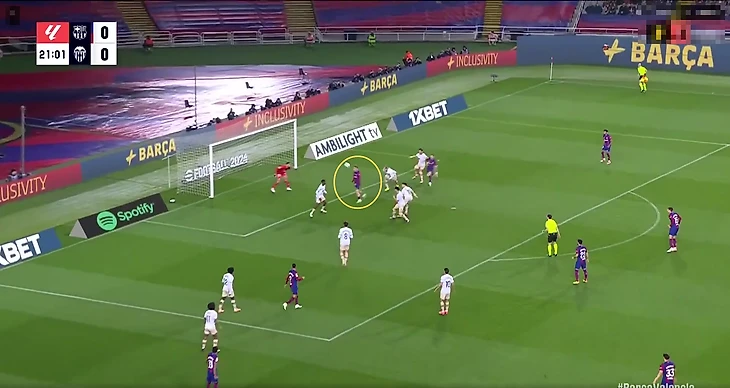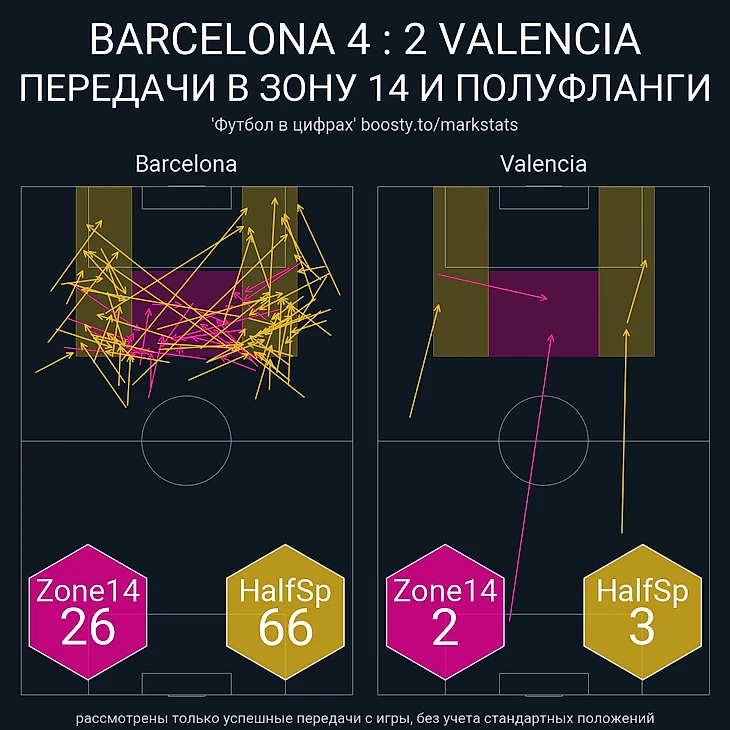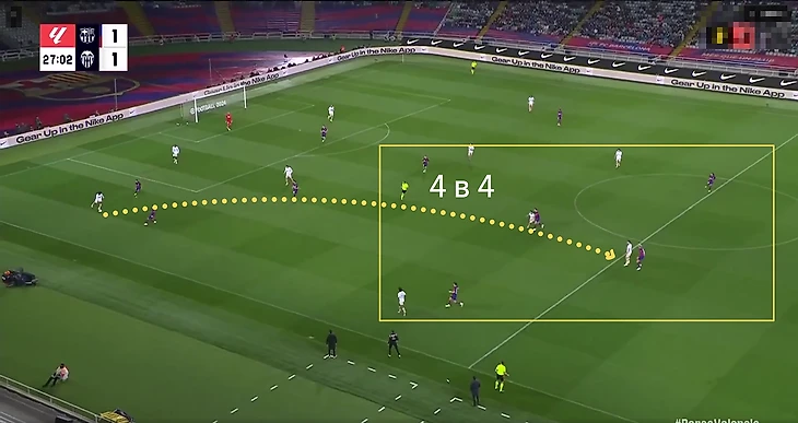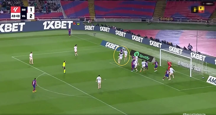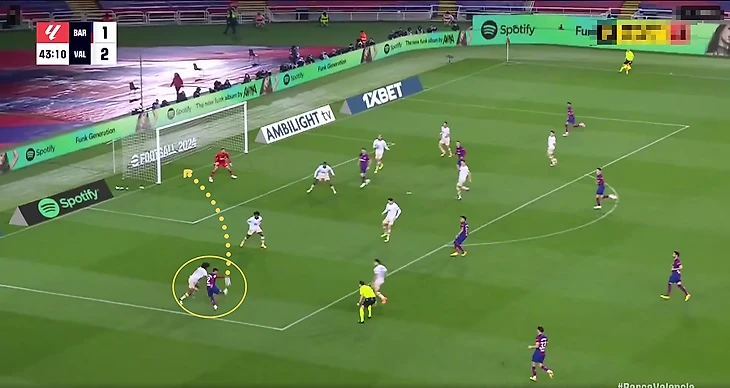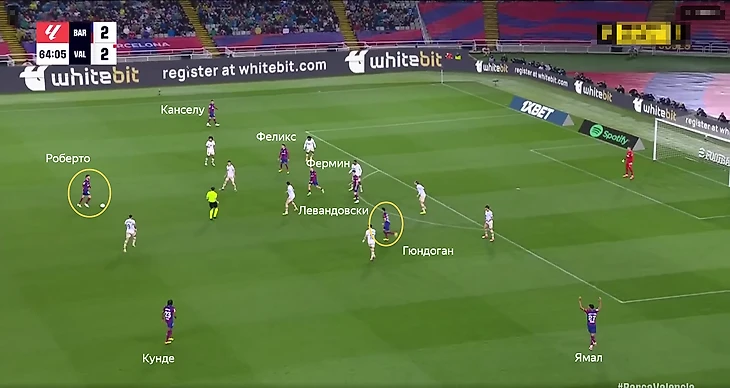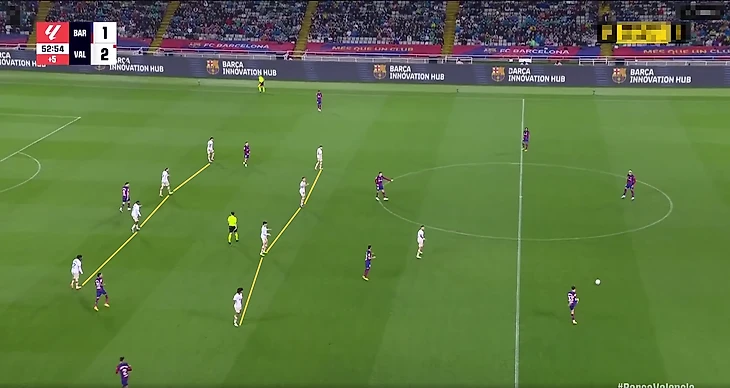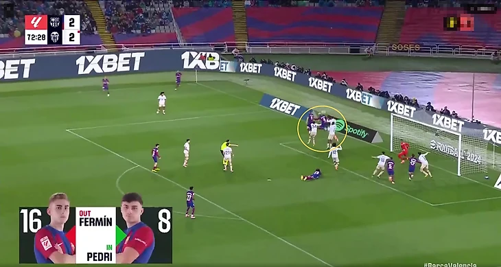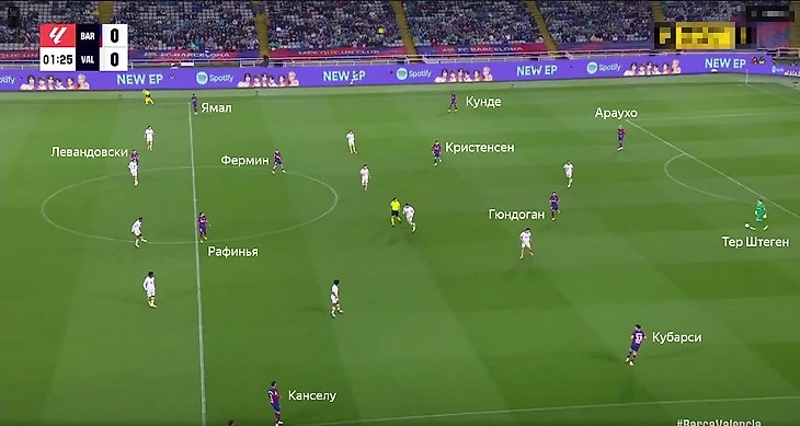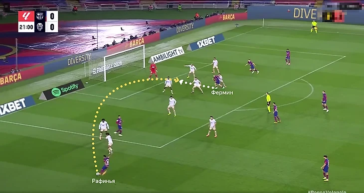 Подачи – часто команда Хави либо пыталась доставлять мяч длинными передачами вперёд из глубины, либо с помощью навесов в штрафную с флангов. Первый гол – отличный пример: Рафинья подаёт в штрафную, Фермин врывается в пространство между игроками «Валенсии» и забивает.