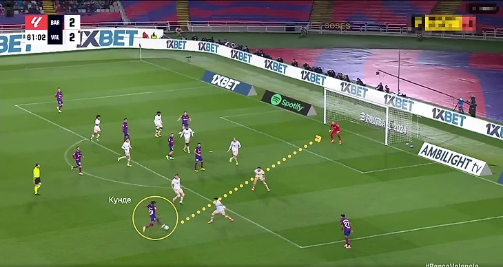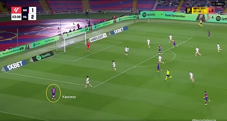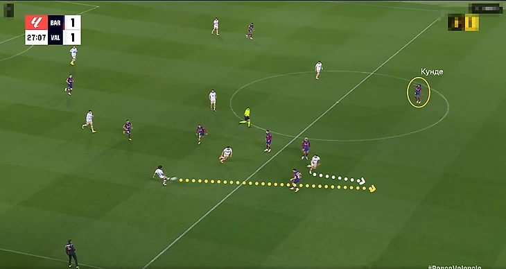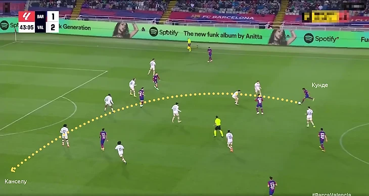 Также в определённые моменты свою роль играла нехватка ширины на флангах у «Валенсии» – каталонцы получали свободу на краях поля. Например, здесь Кунде переводит мяч на свободного на левом фланге Канселу. Португалец получает время на принятие решения и создаёт себе комфортные условия для удара.