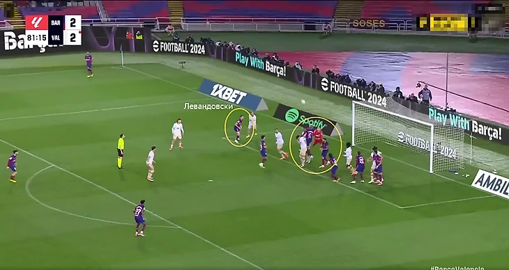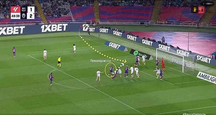 Здесь Левандовски стартует в зоне 11-метровой отметки, игроки «Валенсии» разбирают оппонентов персонально. При этом Ярек Гасьоровски (который вроде должен отвечать за Роберта) располагается далеко от поляка. В результате идёт подача на ближнюю, куда прибегает Левандовски. Так «Барса» сравняла счёт в начале второго тайма.