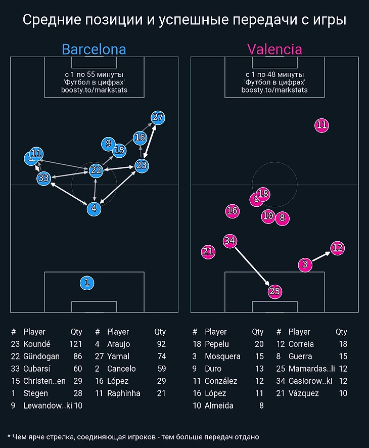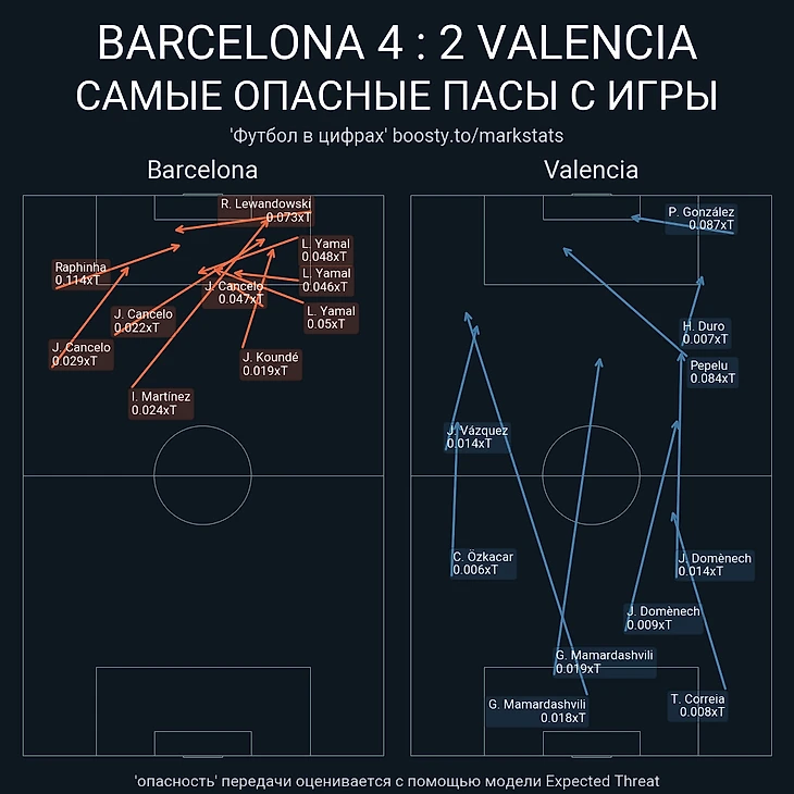 С мячом ставка делалась на два способа выхода в атаку. Первый вариант – контратаки в случае отбора мяча и, например, неудачного контрпрессинга со стороны «Барселоны». Второй способ – длинные передачи из глубины от вратаря или кого-то из защитников. Карта самых опасных передач с игры отлично иллюстрирует намерения валенсийцев.