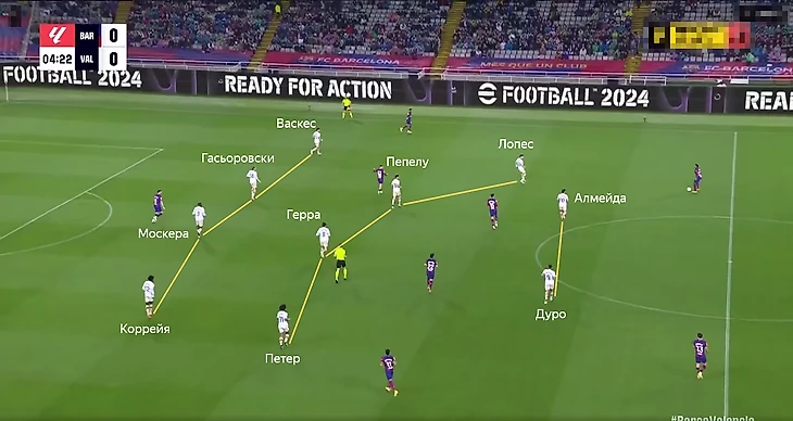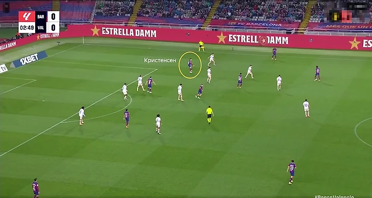 Педри не мог сыграть с первых минут, поэтому в паре опорных вместе с Гюндоганом появился Кристенсен. Датчанин регулярно располагался в высокой позиции в правом полуфланге. Это было вызвано тем, что низкий оборонительный блок «Валенсии» требовал от «Барсы» большего количества игроков в атакующих зонах.