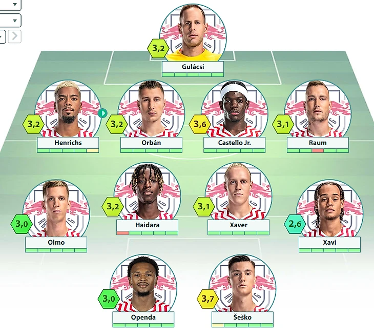 «РБ Лейпциг»: Гулачи – Хенрикс, Орбан, Кастелло, Раум – Ольмо, Айдара, Шлагер, Хави – Шешеко, Опенда