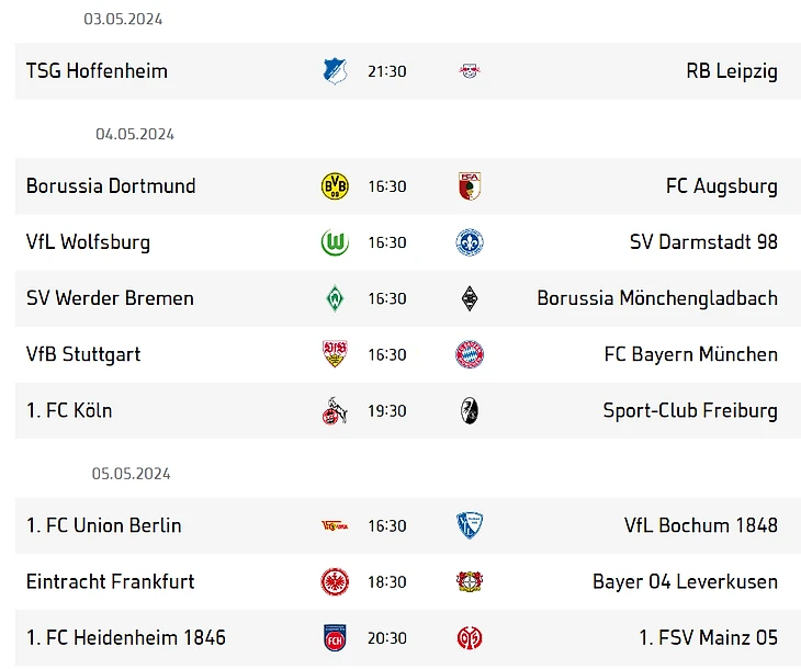 Бундеслига приближается к финишу, однако известен только чемпион и одна вылетевшая команда, всё остальное за три тура до конца ещё может измениться. В пятницу тур откроют «Хоффенхайм» и «РБ Лейпциг» - отличная вывеска. Насыщенные планы на субботу - один полуфиналист Лиги чемпионов в Дортмунде примет «Аугсбург», а другой («Бавария») отправится бороться за второе место в Штутгарт. Вечер субботы предлагается провести, наблюдая за попыткой «Кёльна» остаться в первой лиге. Воскресенье подарит нам выезд полуфиналиста Лиги Европы во Франкфурт, а так же ещё два матча, от результатов которых, напрямую зависит расположение команд внизу таблицы.