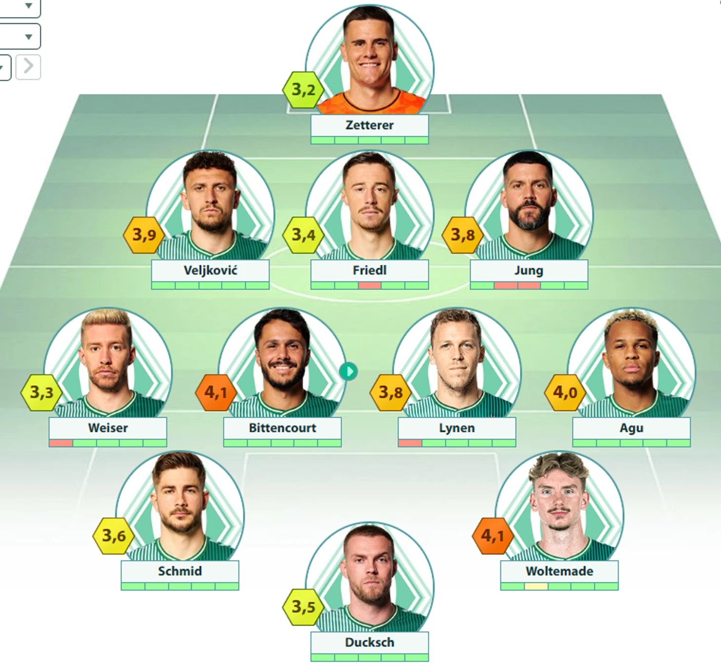 «Вердер» Бремен: Цеттерер – Велькович, Фридль, Юнг – Вайзер, Стаге, Линен, Агу – Шмид, Дукш, Вольтемаде