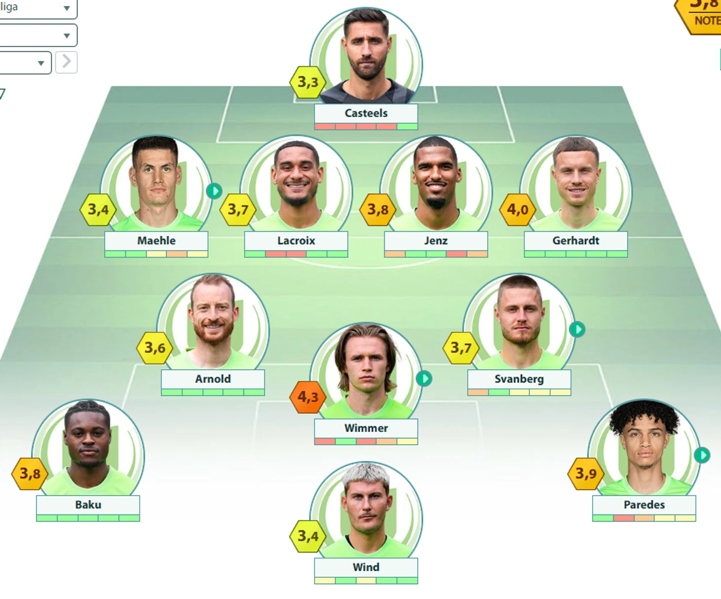 «Вольфсбург»: Кастельс – Фишер, Лакруа, Йенц, Мэле – Сванберг, Арнольд – Баку, Виммер, Паредес – Винд