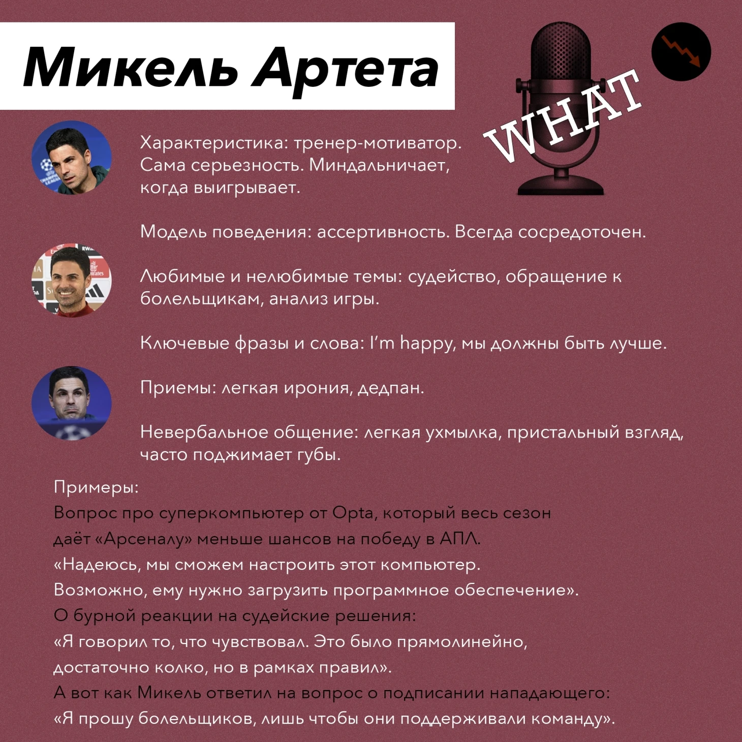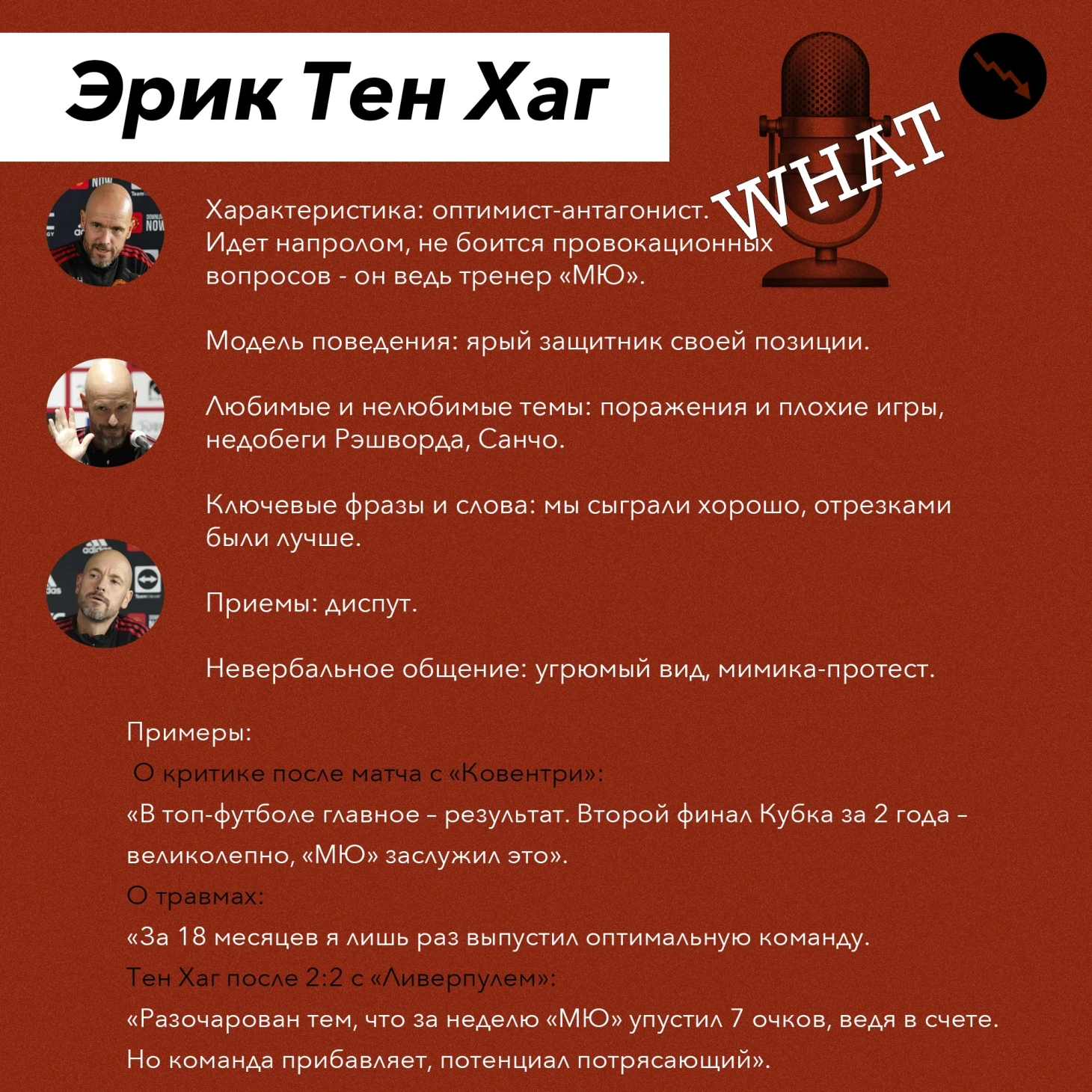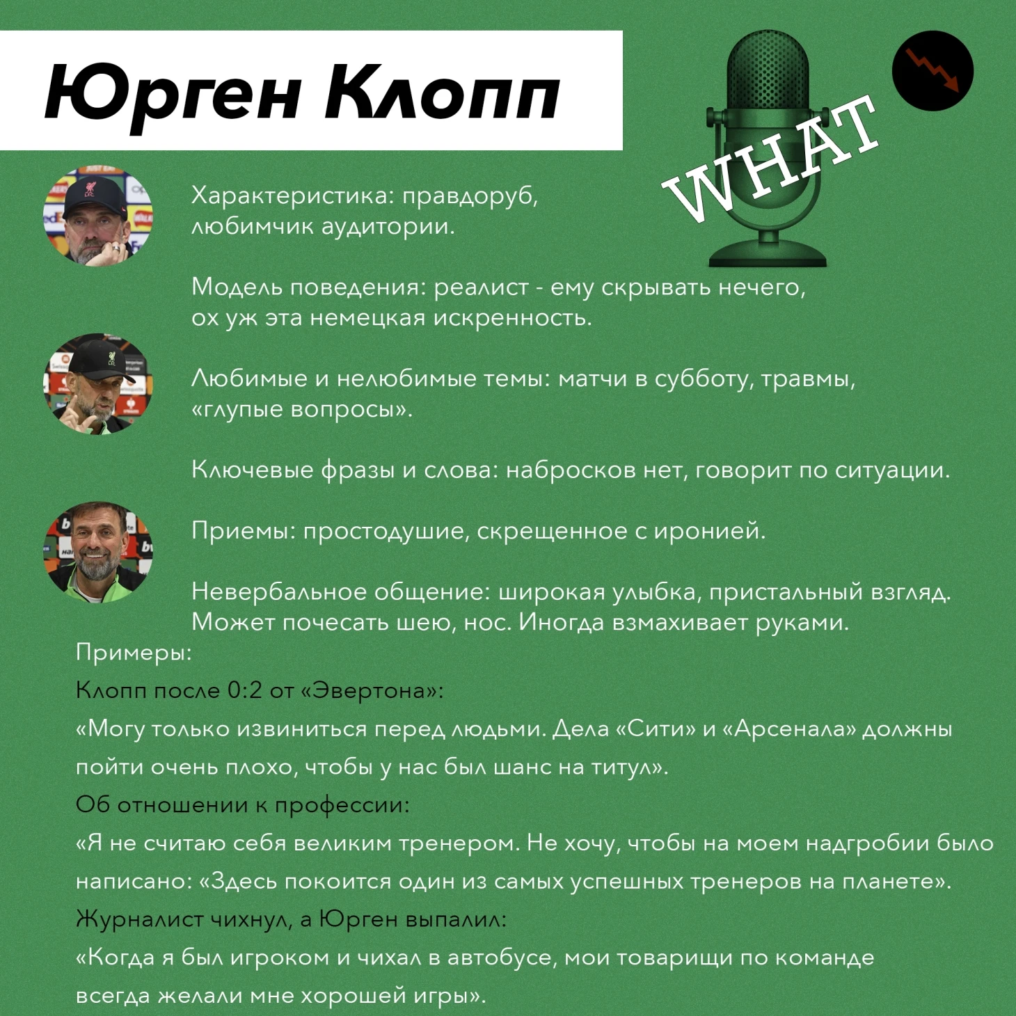 Но мы решили немного пойти дальше: составили фотокарточки с характеристиками поведений ярких коучей перед журналистами. Хотели сделать серьезно, но получилось с дольками комичности.