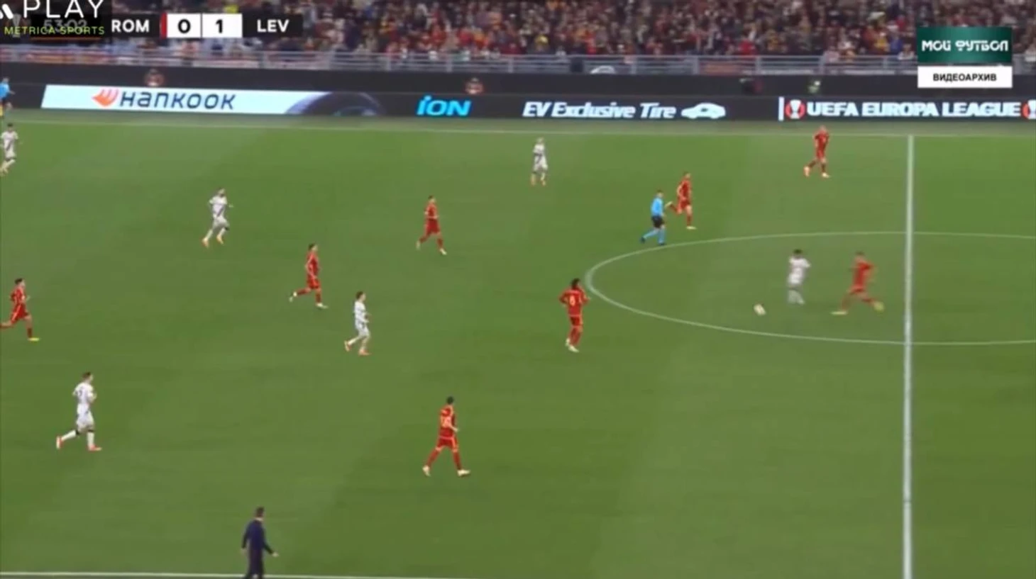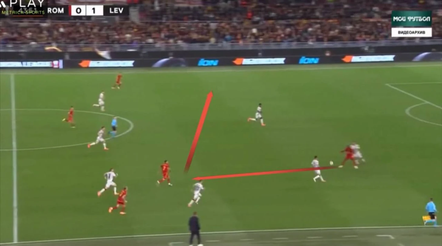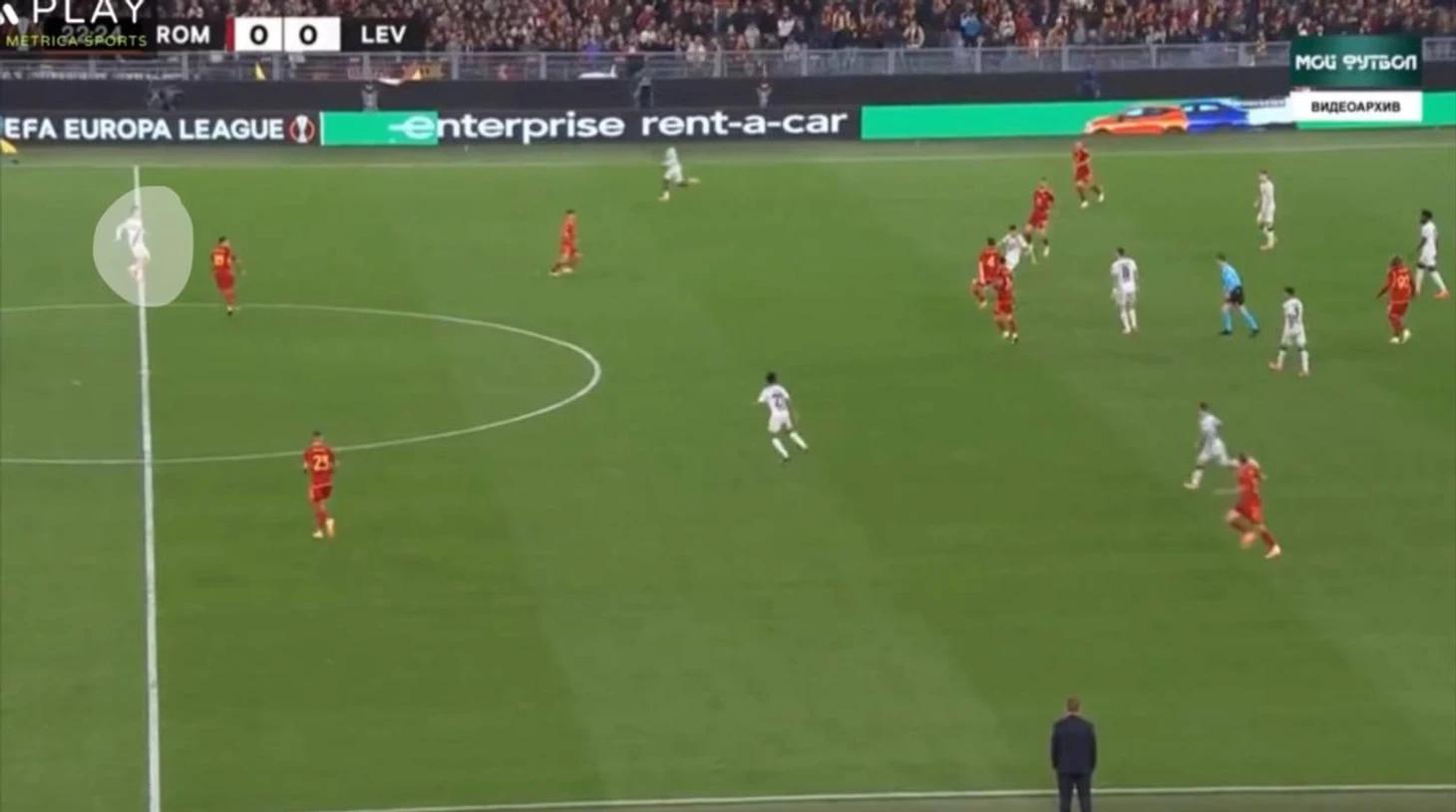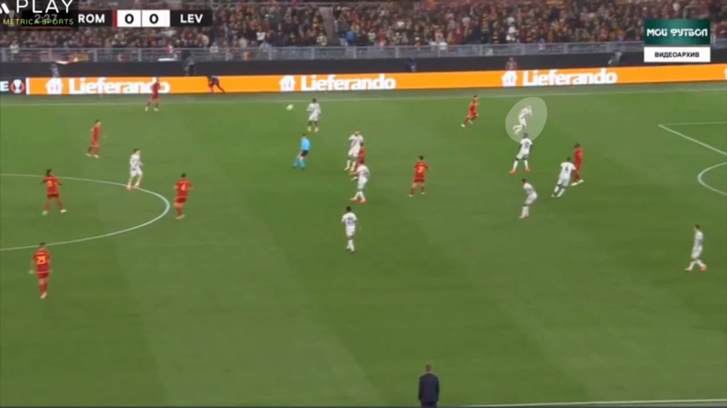 Данный материал в видеоформате доступен в телеграмм-канале. Казалось, что Рома на своем родном стадионе в Италии сможет навязать борьбу этому «неверлузену». Но банду Хаби Алонсо не остановить даже злому Де Росси. Обе команды предложили друг другу высокий прессинг, потому что обе хотели владеть мячом. Поэтому с разбора прессинга и начнем. Начнем с прессинга команды Алонсо. Два игрока Виртц и Адли поднимались по двум центральным защитникам, Джака приходил и забирал опорника, слева Гримальдо поднимался к крайнему защитнику, а справа это делал Фримпонг, остается забрать игрока в центре, на которого выдвигался центральный защитник, получался вот такой персональный прессинг.