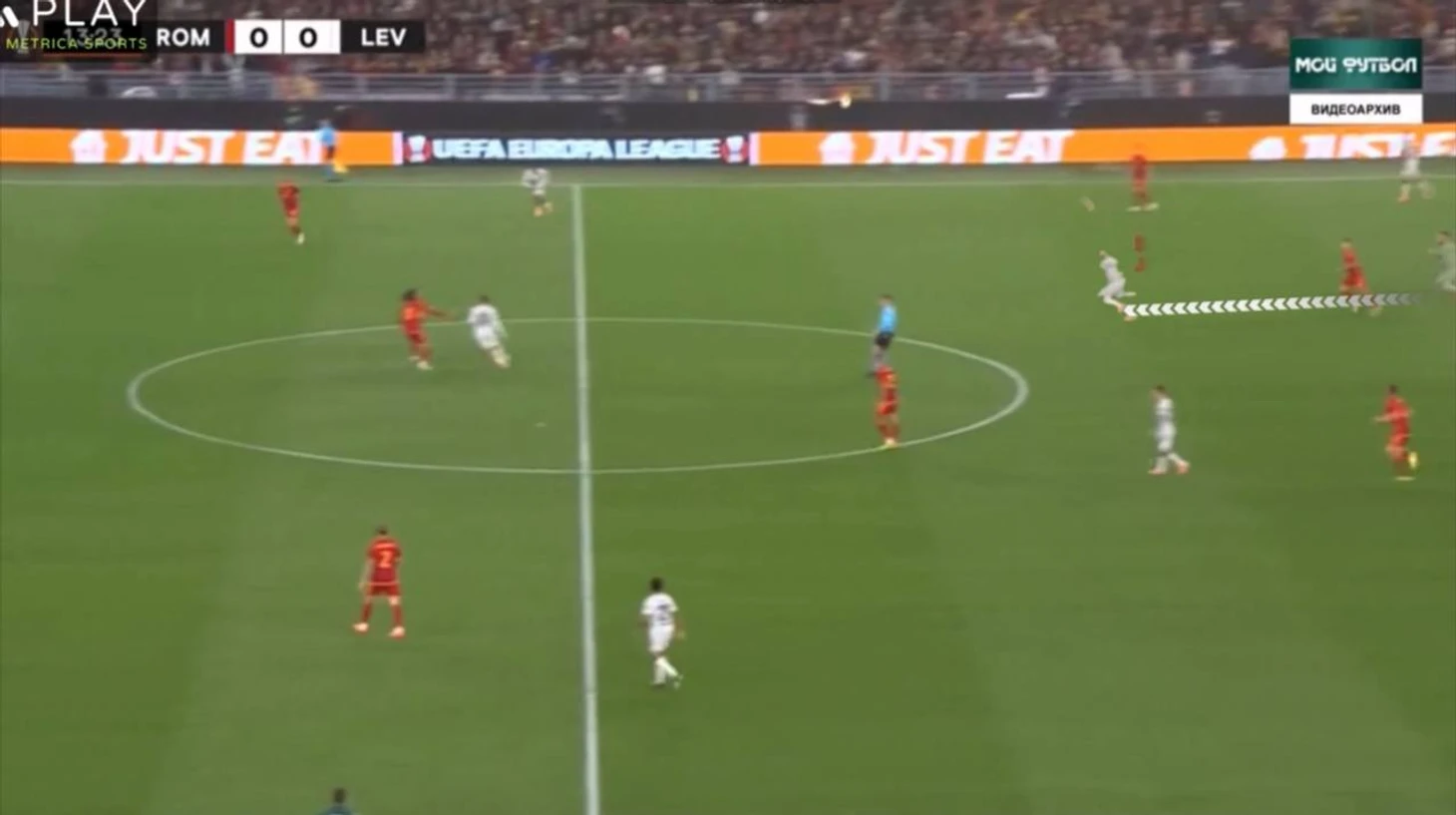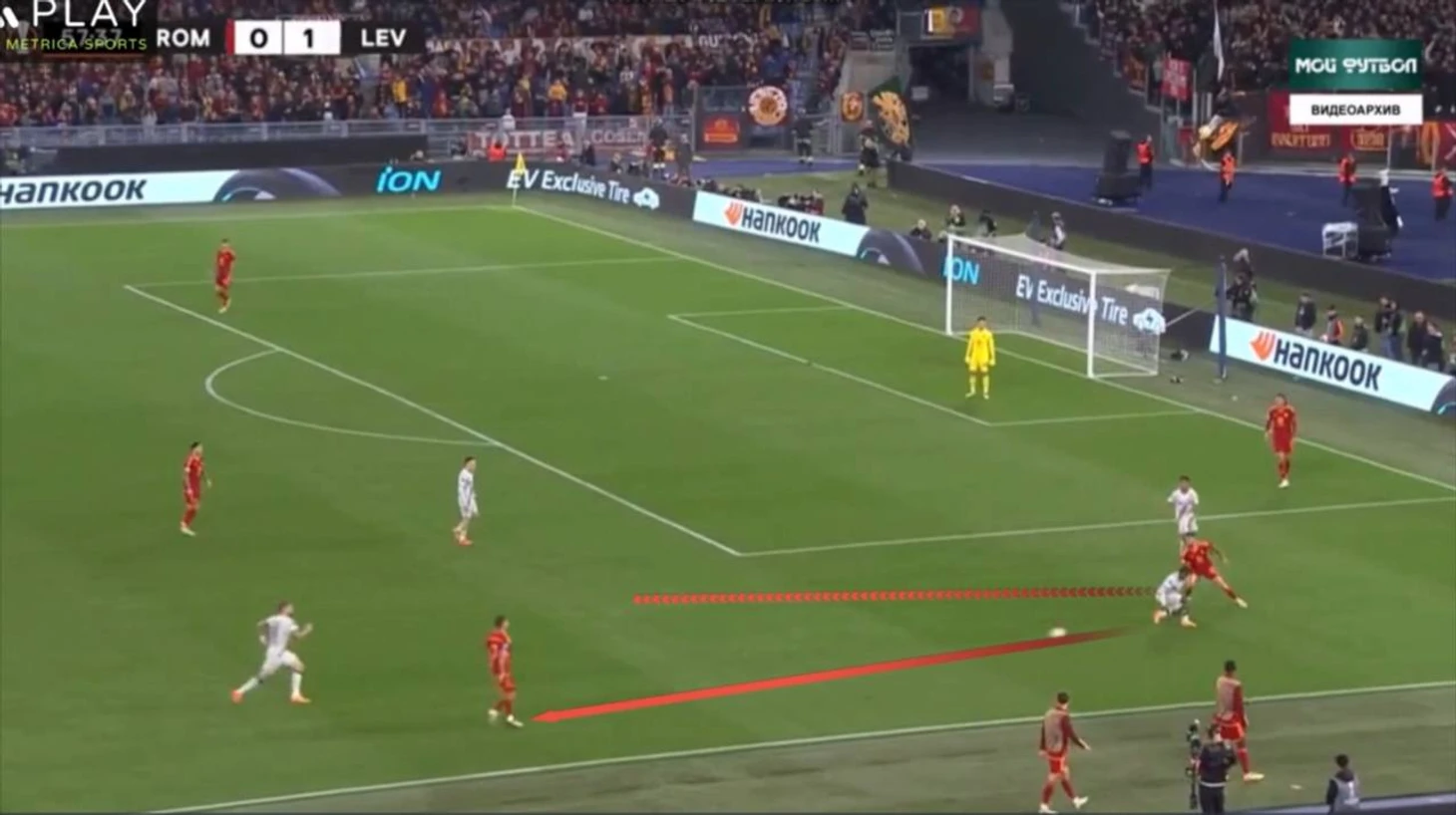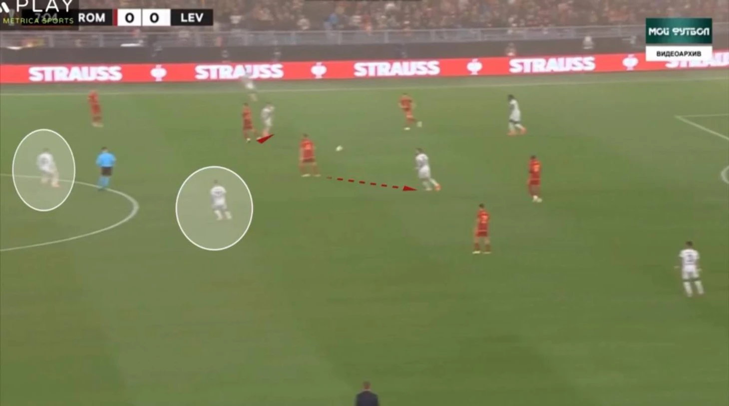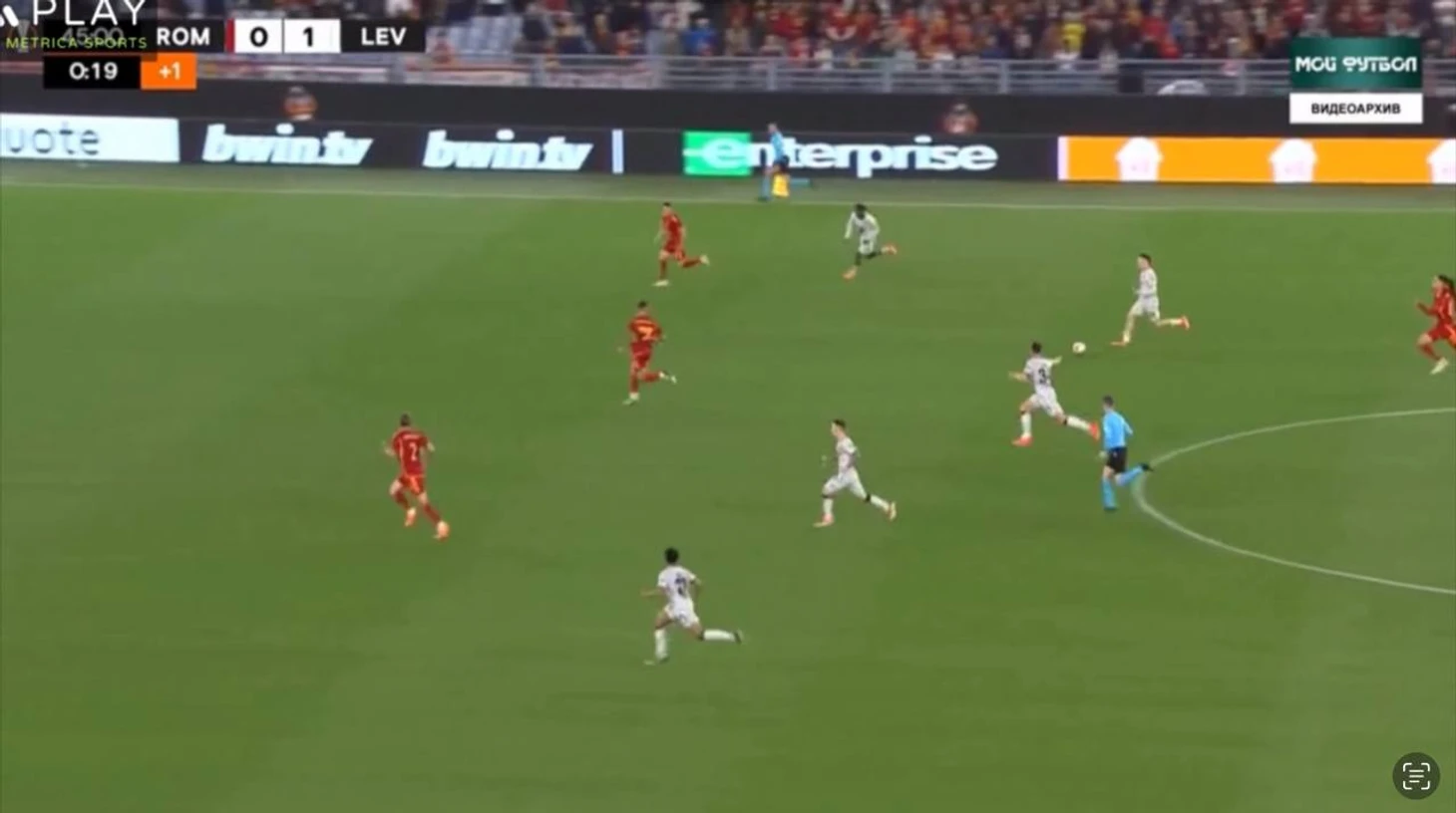 Данный материал в видеоформате доступен в телеграмм-канале. Казалось, что Рома на своем родном стадионе в Италии сможет навязать борьбу этому «неверлузену». Но банду Хаби Алонсо не остановить даже злому Де Росси. Обе команды предложили друг другу высокий прессинг, потому что обе хотели владеть мячом. Поэтому с разбора прессинга и начнем. Начнем с прессинга команды Алонсо. Два игрока Виртц и Адли поднимались по двум центральным защитникам, Джака приходил и забирал опорника, слева Гримальдо поднимался к крайнему защитнику, а справа это делал Фримпонг, остается забрать игрока в центре, на которого выдвигался центральный защитник, получался вот такой персональный прессинг.