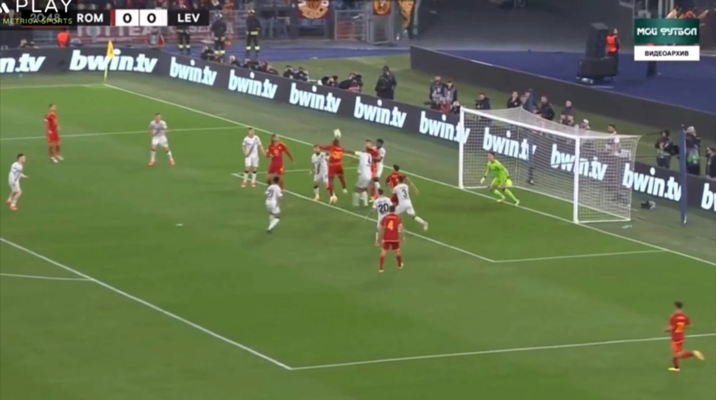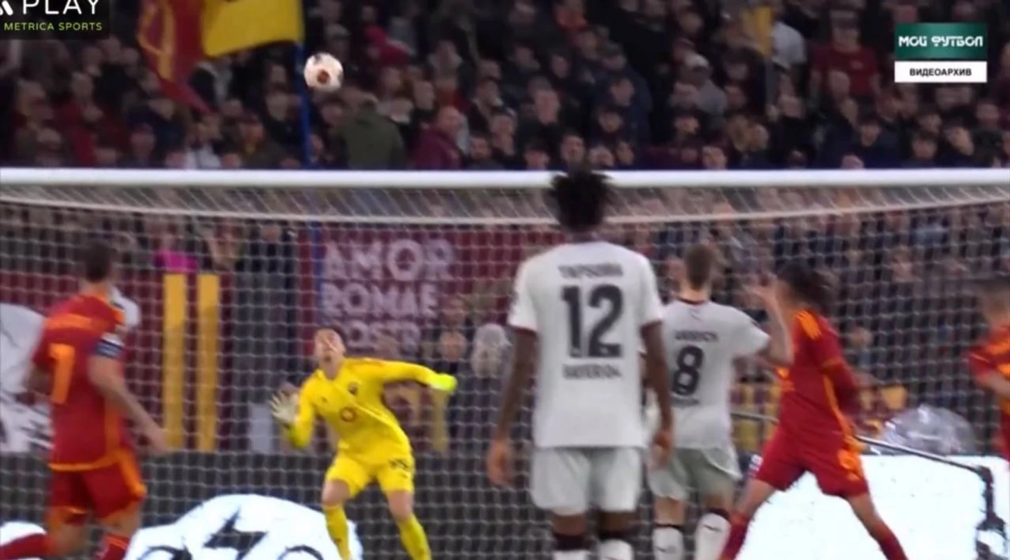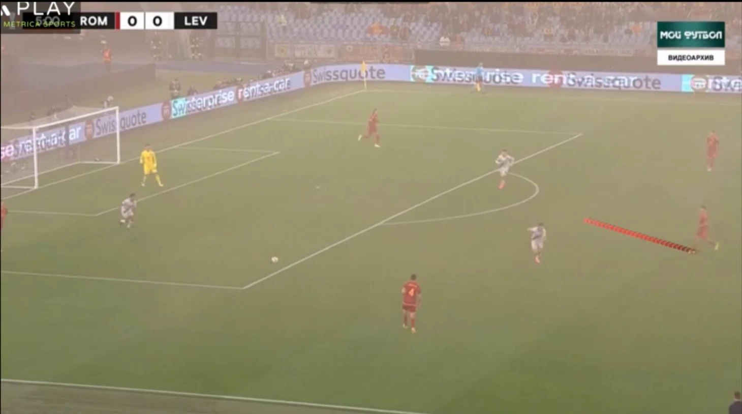 Плюс ко всему у Байера справа играл хоть и высокий, но не ловкий ни разу Станишич, который вот допустим если тут еще успел перестроится, то вот в этом моменте уже не достал и получил мяч за свою спину, что привело к опасному моменту Ромы.