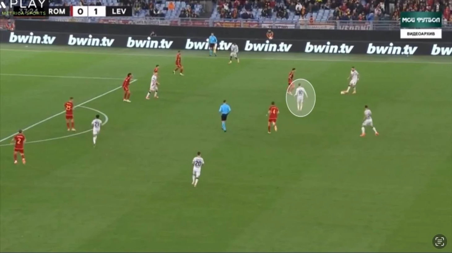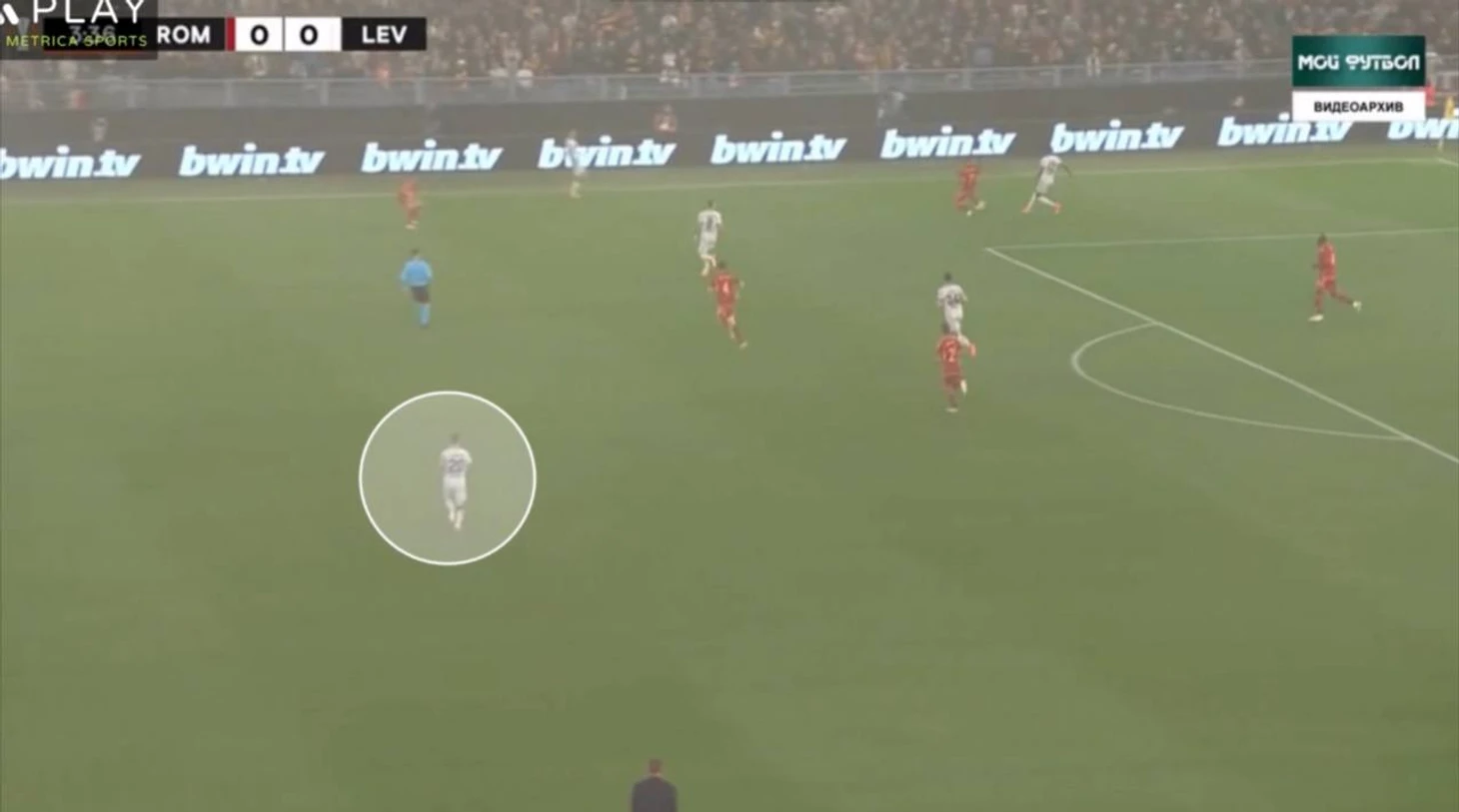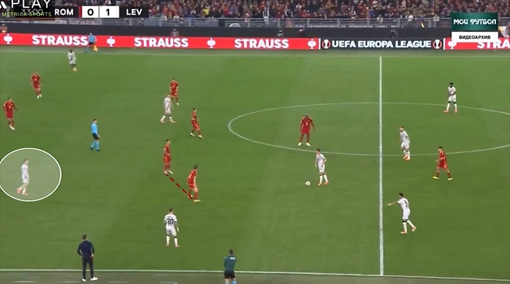 Поэтому как бы ни просил Де Росси успокоиться своих подопечных нити игры были упущены и прибраны Байером, к началу атак которого как раз и перейдем. Рома тоже не стеснялась прессинговать, механизм был таков, нападающий загонял вратаря, чтобы он начинал в один из флангов, куда и шло смещение всей команды Ромы, Паредес падал назад для баланса, а вингер с другого фланга заужал к опорнику Байера, тем самым Рома бросала игроков с другого фланга, чтобы разобрать всех игроков в зоне мяча, а сзади создать большинство. Вот так это выглядело в игре, и даже сработало один раз, после чего Рома создала неплохой момент с ударом Дибала.