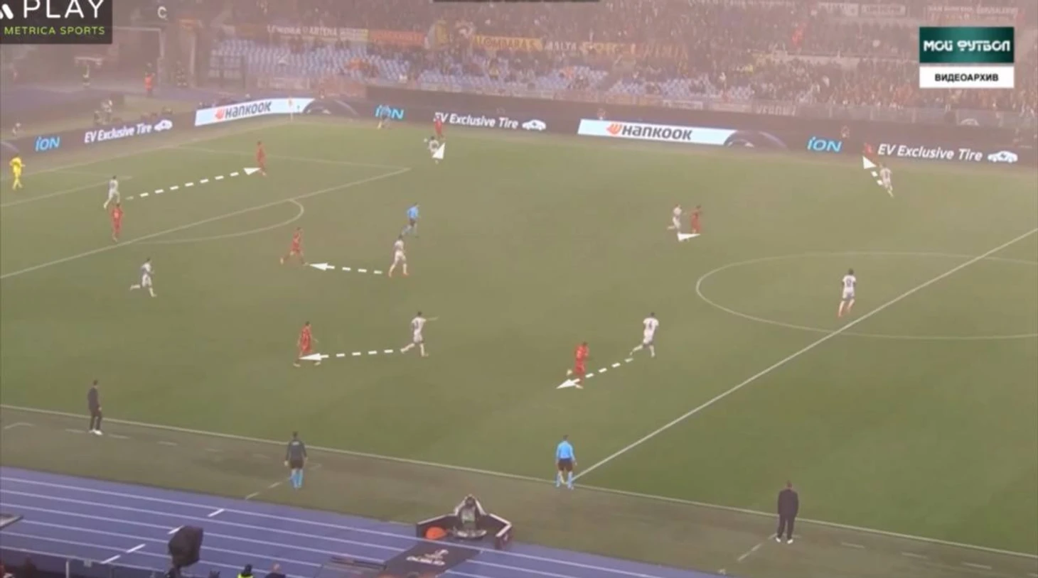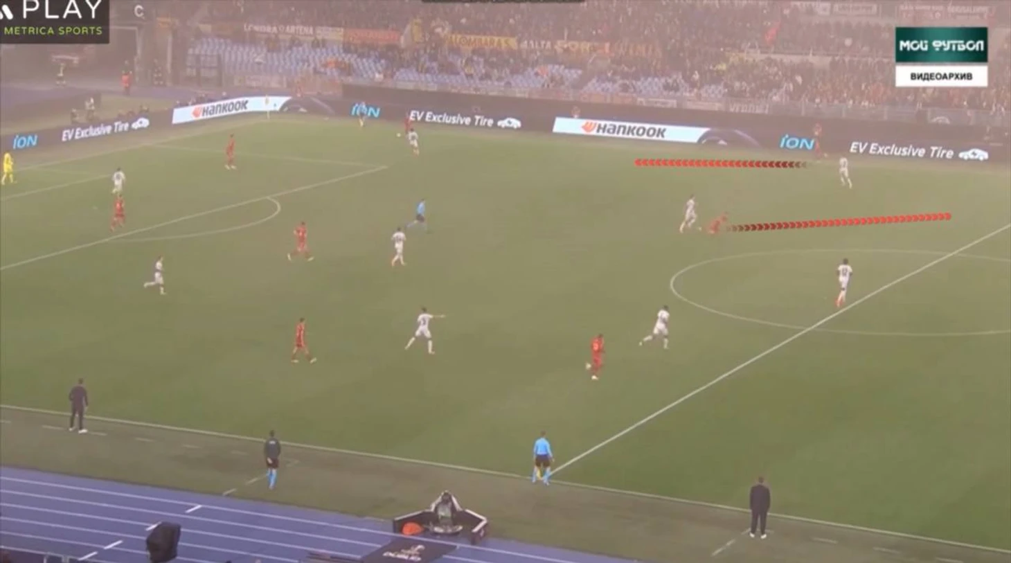 Второй вариант движения был на фланге, когда крайний нападающий приходил вниз, а один из полузащитников делал движение в свободную зону, вот как здесь Рома пыталась провернуть, но было нарушение на вбегающем игроке.