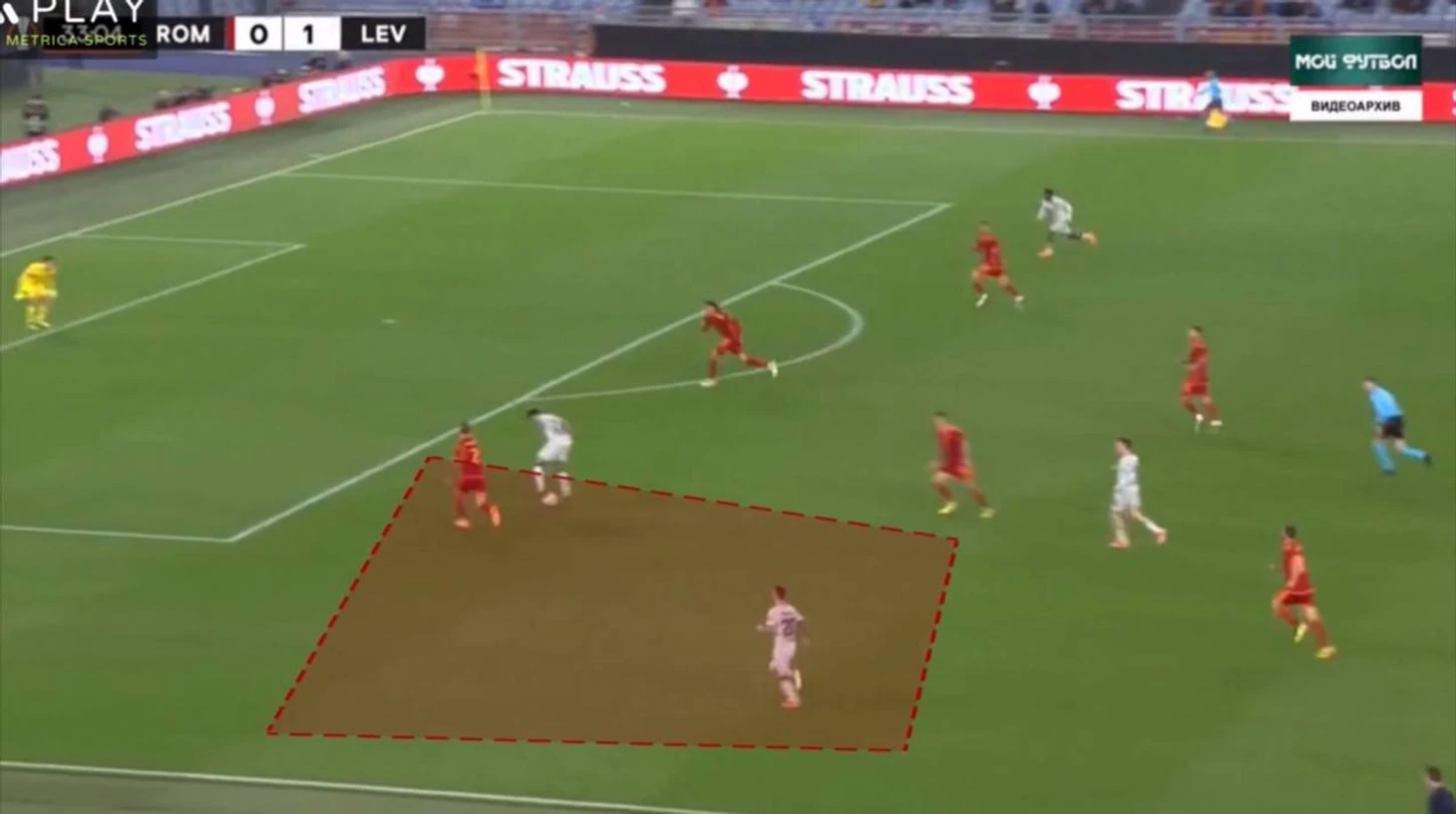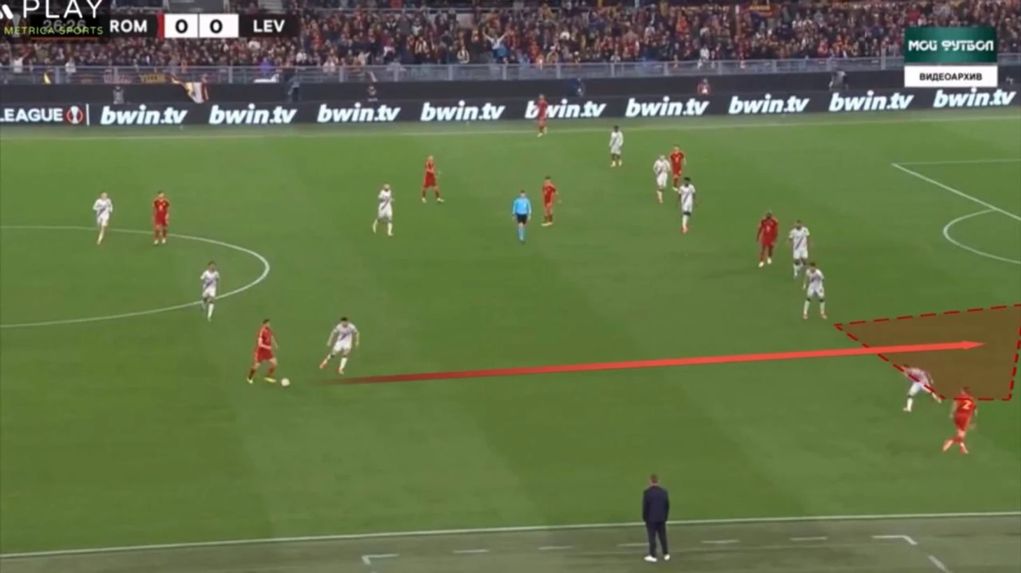 Помимо всего этого в атаке у Ромы основной акцент был построен на использование слабой зоны в схеме Байера, а слабая зона схемы в 5 защитников - это зона между крайним центральным защитником и латералем, который реагирует на крайнего нападающего соперника, вот она как раз и Рома пыталась туда доставлять мяч длинными передачами.