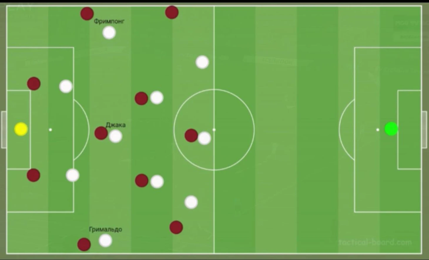 С другого фланга вообще иногда получалось и низом исполнить передачу как раз в эту самую зону, потому что Гримальдо не такой быстрый как Фримпонг.