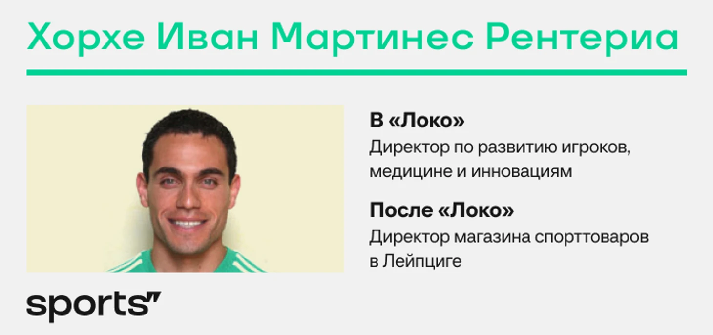 Мексиканец Хорхе Иван Мартинес Рентериа получил в «Локо» солидную должность директора по развитию игроков, медицине и инновациям. После России о футбольной карьере Рентериа ничего неизвестно, зато летом 2023-го он основал в Лейпциге компанию по импорту и экспорту спортивных товаров, а также оказанию спортивных консультаций (что-то вроде услуг личного фитнес-тренера).