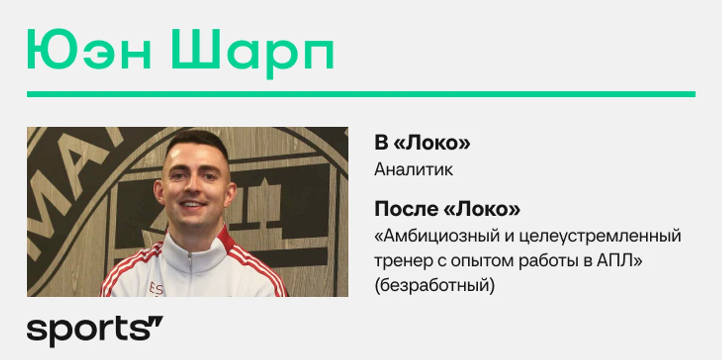 Аналитик Юэн Шарп недолго проработал в «Локо», уже в декабре 2021-го Рангник забрал его с собой в «МЮ». После этого шотландец был ассистентом Джесси Марша в «Лидсе», а после увольнения штаба американца в феврале 2023-го ищет работу.