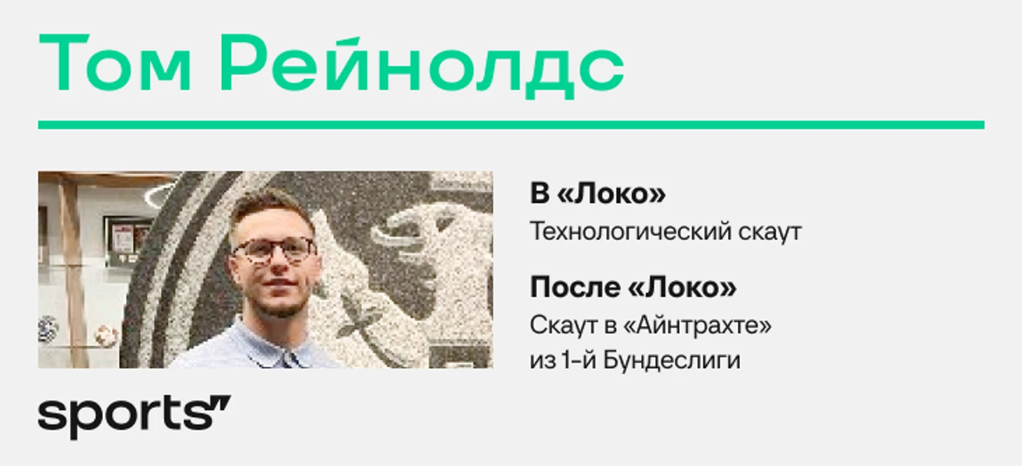 Том Рейнолдс в «Локо» занимался технологическим скаутингом.С марта 2023-го бывший менеджер Opta по инновациям работает скаутом в «Айнтрахте».