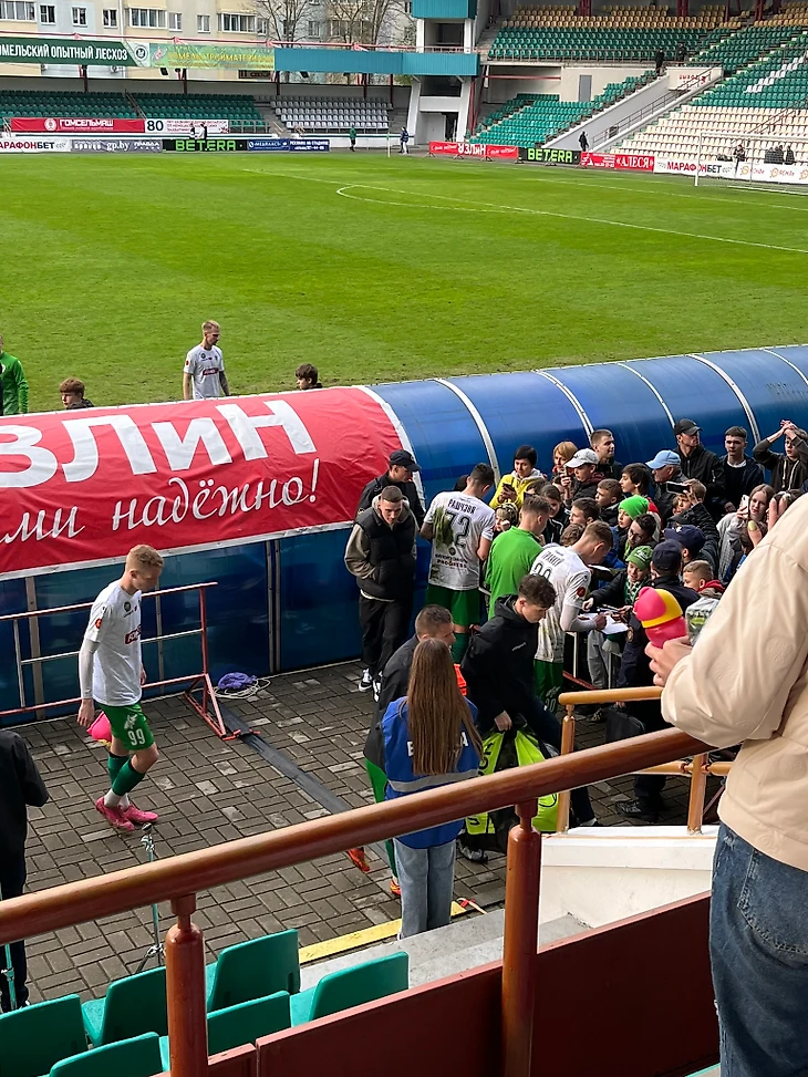 После финального свистка болельщики двинулись к скамейке запасных Гомеля, чтобы получить возможность сфотографироваться и взять автографы у футболистов. Те, в свою очередь, не отказали в такой возможности.