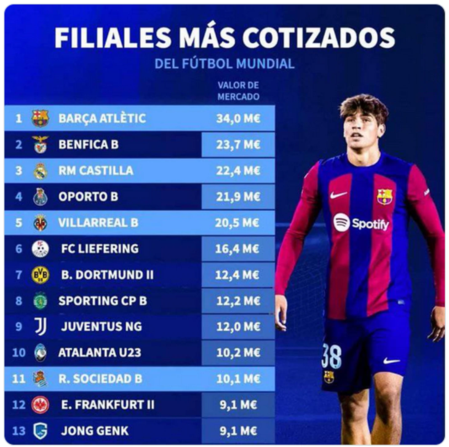 На этой неделе появилась интересная информация, что «Барселона Б» обладает самой большой стоимостью состава среди дублирующих команд. Большой отрыв обеспечивают 2 игрока, уже дебютировавших за основной состав, а также 3 игрока, пришедшие из других клубов с уже заметной трансферной стоимостью на момент появления в составе «Барселоны Б». Что характеризует векторы трансферной и кадровой политики клуба: доверие молодым и активный поиск на уровне молодежных составов.