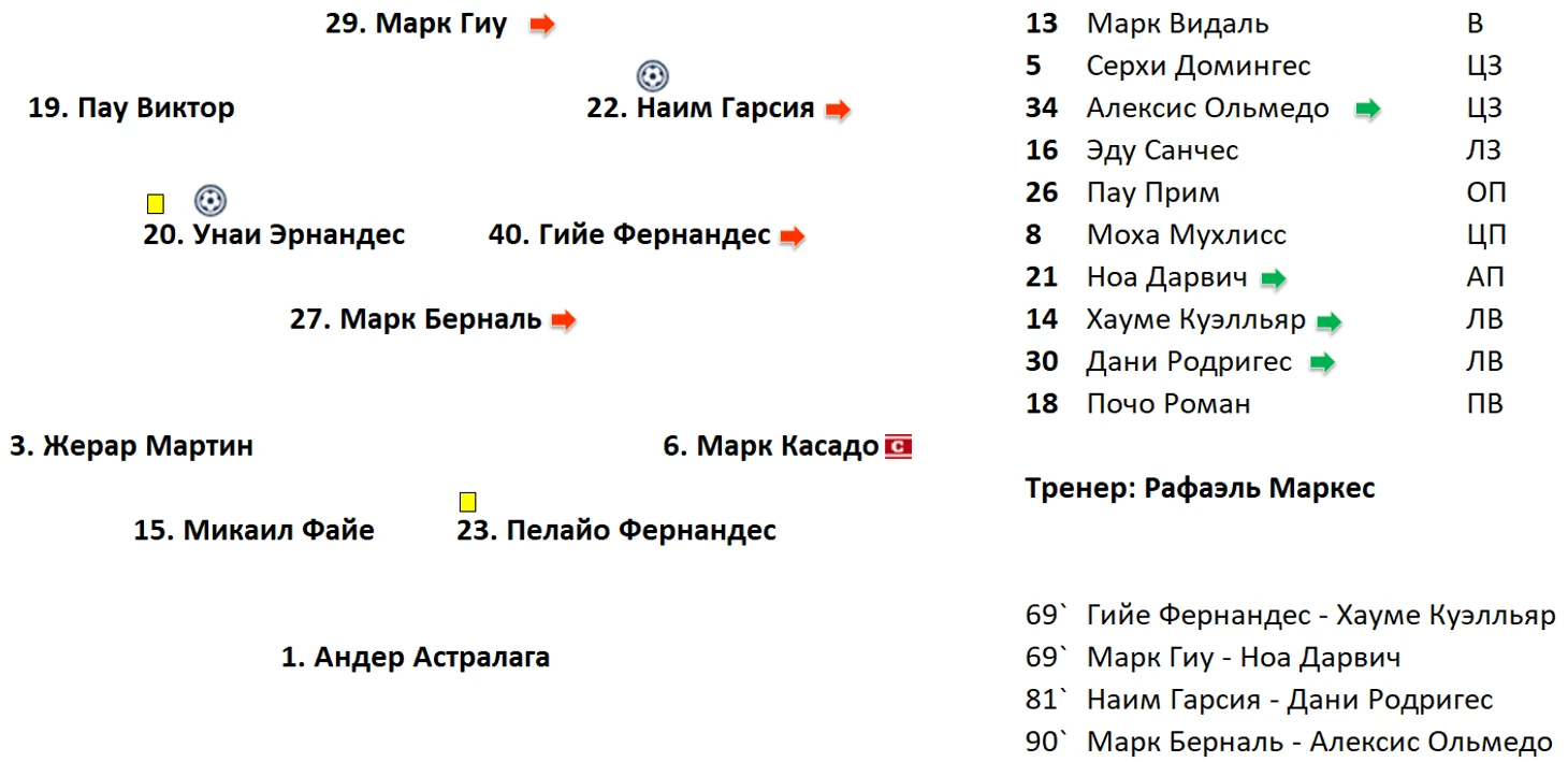 Прекрасным голом и эффектными действиями в целом ряде эпизодов отметился Унаи Эрнандес. 19-летний игрок проводит яркий сезон и является одним из лидеров команды. Играет на позициях инсайда и левого вингера. На его счету 6 голов, 6 передач и статус второго бомбардира команды после Пау Виктора. Унаи уже привлекали к тренировкам с основой, контракт с игроком подписан до 30 июня 2025 года с опцией продления на 2 года.