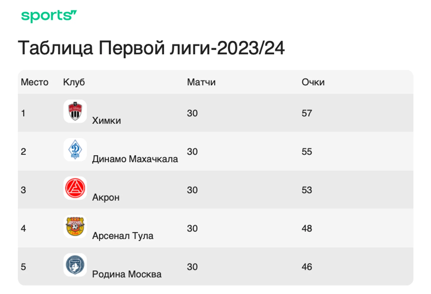 Если «Акрон» ближе к борьбе за топ-2, то за четвертую строчку поспорит «Родина»: у московской команды 46 очков. Хотя сейчас она в кризисе: всего одна победа в шести матчах.