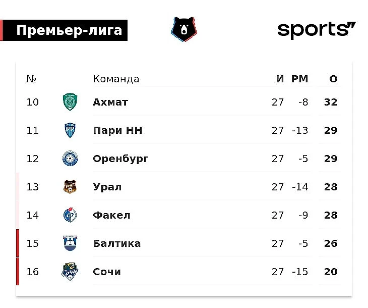 Напоминаем: 15-е и 16-е места – прямой вылет, 13-е и 14-е – стыковые матчи против команд из Первой лиги.